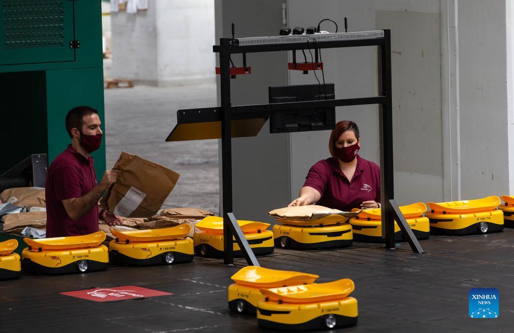Employees of Greece's national postal services provider Hellenic Post (ELTA in Greek) work with a Chinese-made robotic system for sorting mail items at the facilities of ELTA at Kryoneri, a northern suburb of Athens, Greece, Sept. 14, 2021. The ELTA in Greek has started using a Chinese-made robotic system for sorting mail items, aiming to accelerate the process and improve service for customers. The fully digitalized automated system is developed by China's Zhejiang LiBiao Robot Co., Ltd. Since mid-August, a fleet of 55 tiny yellow robots has joined employees at the Group's facilities in Kryoneri (Xinhua/Marios Lolos)