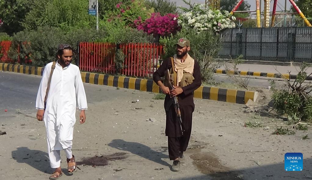 Afghan Taliban members are seen at the site of a blast in Jalalabad city of Nangarhar province, Afghanistan, Sept. 25, 2021. A blast rocked Jalalabad city, the capital of eastern Nangarhar province, Afghanistan, on Saturday with no report on casualties, local media reported. (Photo by Hamidullah/Xinhua)