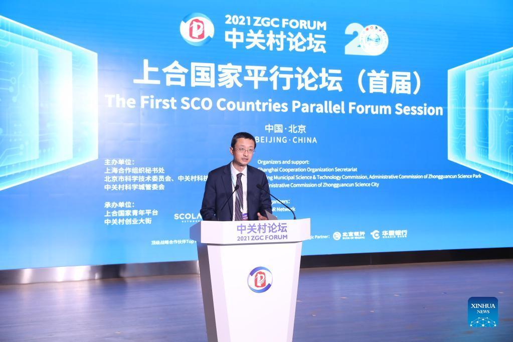 Li Junjie, executive deputy district head of Haidian in Beijing, speaks at the First Shanghai Cooperation Organization (SCO) Countries Parallel Forum Session of Zhongguancun Forum in Beijing, capital of China, on Sept. 26, 2021. (Zhongguancun Innoway/Handout via Xinhua)