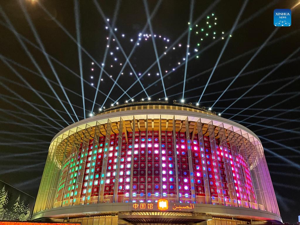 Photo taken on Oct. 4, 2021 shows the light show at the China Pavilion of Expo 2020 Dubai in Dubai, the United Arab Emirates. Covering an area of 4,636 square meters, the China Pavilion is one of the largest at the expo. Featuring a lantern-shaped design, the pavilion is called "The Light of China," symbolizing hope and a bright future. (Xinhua/Su Xiaopo)