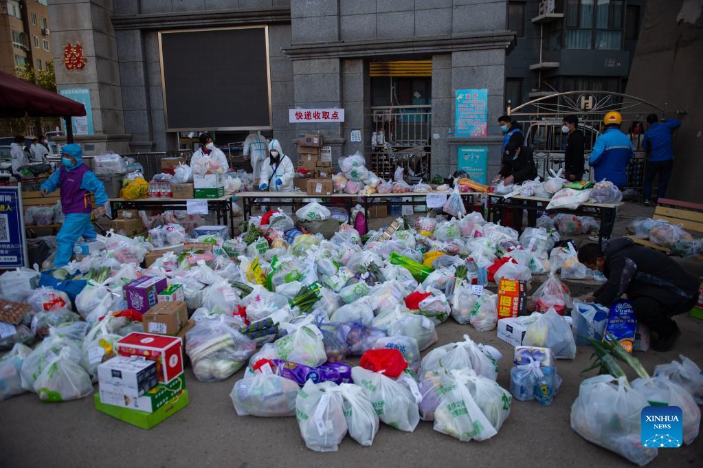 Photo taken on Oct. 23, 2021 shows a delivery site outside the Hongfuyuan residential community in Changping District of Beijing, capital of China, Oct. 23, 2021. The Hongfuyuan residential community was listed as high risk of COVID-19 on Saturday and has been put under closed-off management. (Xinhua/Chen Zhonghao)