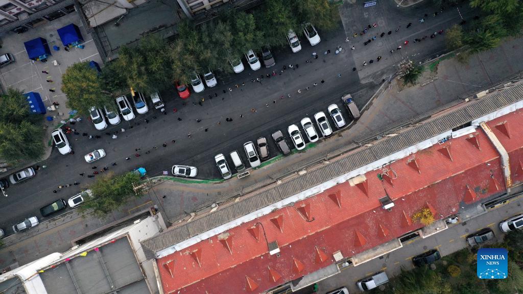 Aerial photo taken on Oct. 28, 2021 shows people queueing up to receive nucleic acid tests in Xining, northwest China's Qinghai Province. After Xining reported 3 new COVID-19 cases, local control of epidemic prevention has been strengthened. (Xinhua/Zhang Hongxiang)