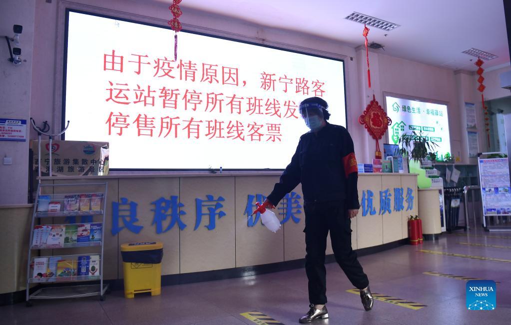 A staff member disinfects the ticket hall of a bus terminal in Xining, northwest China's Qinghai Province, Oct. 28, 2021. After Xining reported 3 new COVID-19 cases, local control of epidemic prevention has been strengthened. (Xinhua/Zhang Hongxiang)