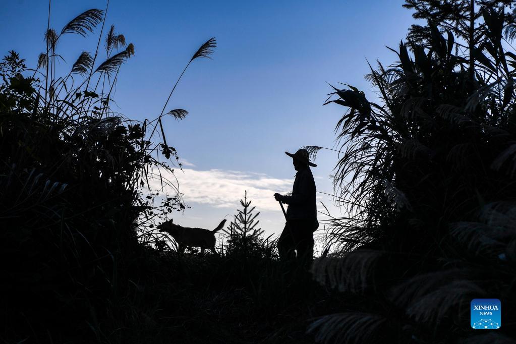 Lei Qiyuan patrols in Dongxiang Town of Wuxuan County, south China's Guangxi Zhuang Autonomous Region, Nov. 24, 2021. Lei Qiyuan, 66, has been engaged in forest protection for 17 years. Working at an altitude of over 1,400 meters above sea level, Lei is in charge of an area of 5,800 mu (about 386.7 hectares). Lei, trekking several hours every day in patrols, shoulders the responsibility of keeping the forests safe from fire and illegal cutting-down. (Xinhua/Cao Yiming)