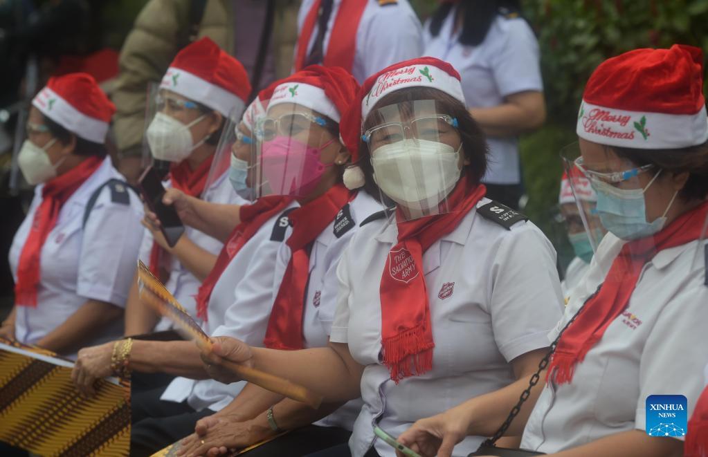 People wearing masks participate in a Christmas carol service at the roadside in Jakarta, Indonesia, Dec. 21, 2021. (Xinhua/Zulkarnain)