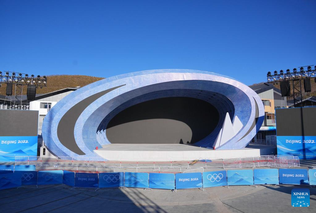 The stage for the awarding ceremony is seen at Zhangjiakou competition zone of the Beijing 2022 Olympic and Paralympic Winter Games, in Zhangjiakou, north China's Hebei Province, Dec. 28, 2021. (Xinhua/Yang Shiyao)