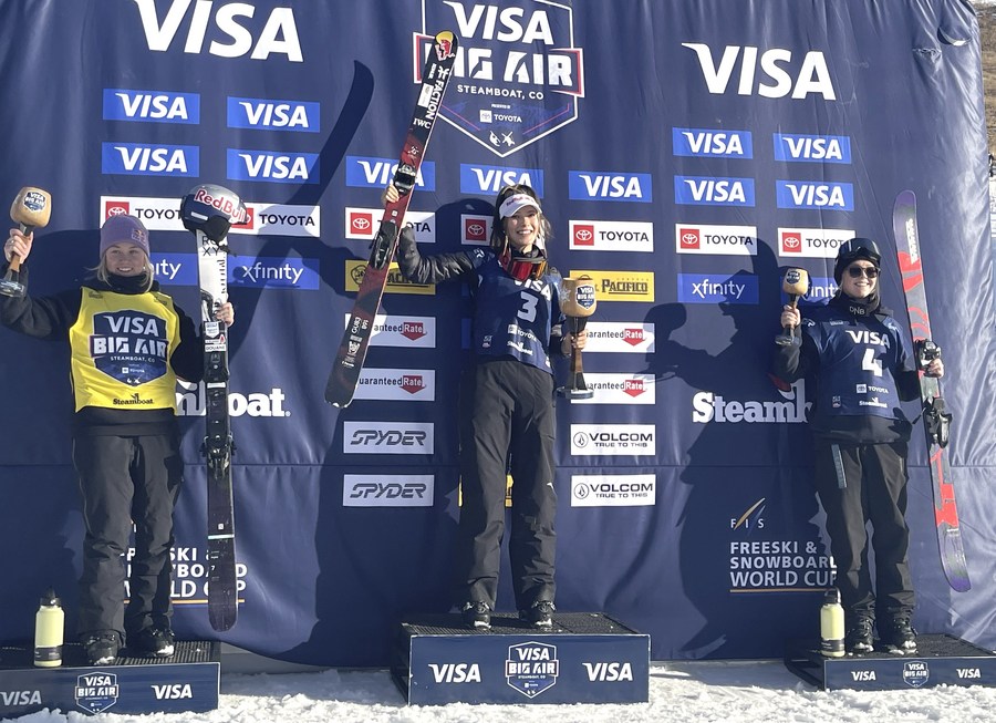 Gu Ailing (C) of China celebrates on the podium during the awards ceremony at the FIS freeski Big Air World Cup in Steamboat, Colorado, on Dec. 4, 2021. (Photo by Li Yang/Xinhua)