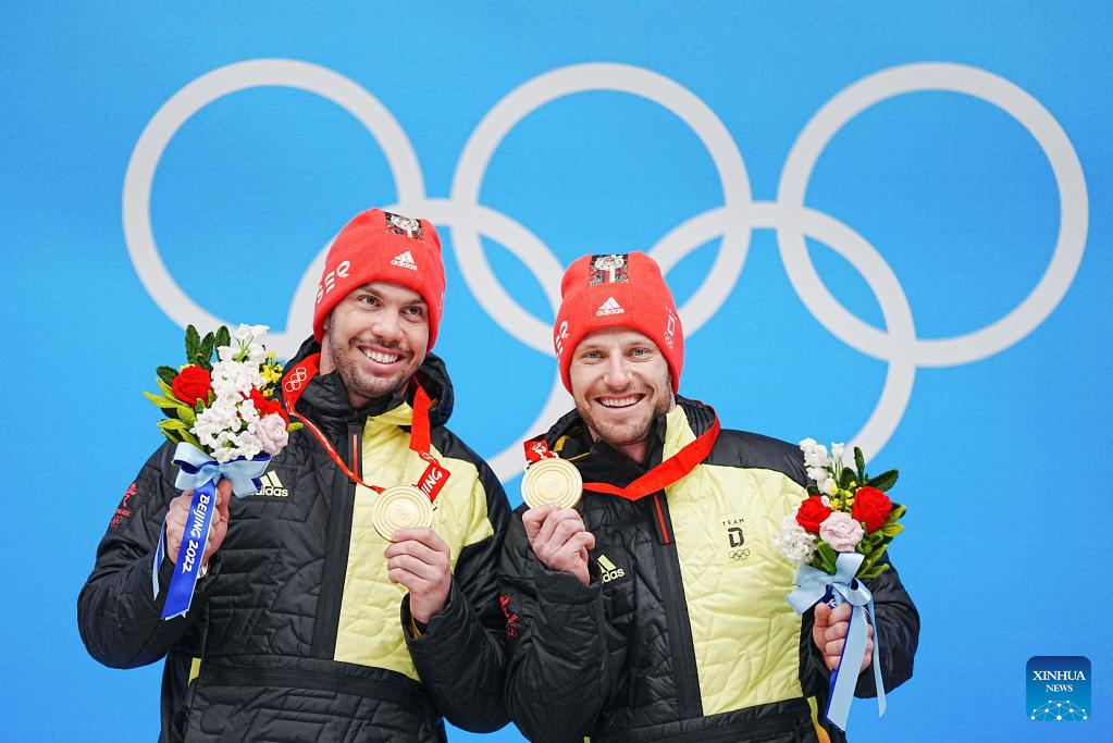 Gold medalists Tobias Wendl/Tobias Arlt of Germany celebrate during the awarding ceremony of luge doubles run at the Yanqing National Sliding Centre in Yanqing district of Beijing, capital of China, Feb. 9, 2022. (Xinhua/Jiang Wenyao)