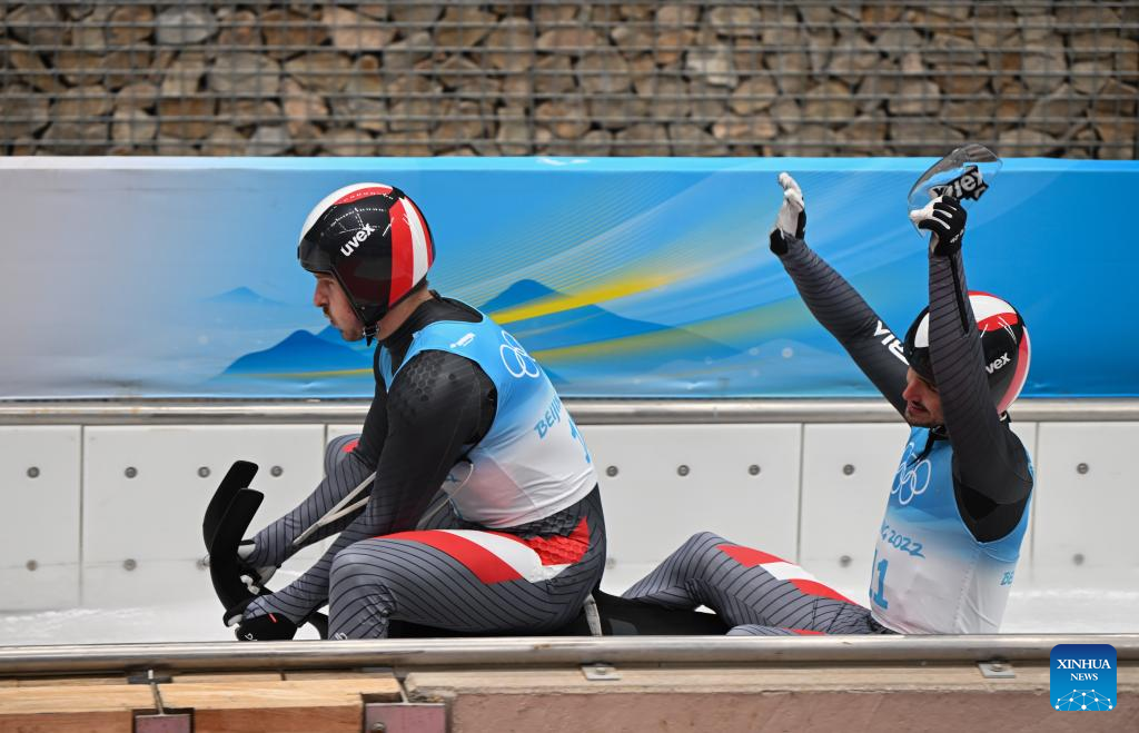 Thomas Steu/Lorenz Koller of Austria react after luge doubles run at the Yanqing National Sliding Centre in Yanqing district of Beijing, capital of China, Feb. 9, 2022. (Xinhua/Sun Fei)