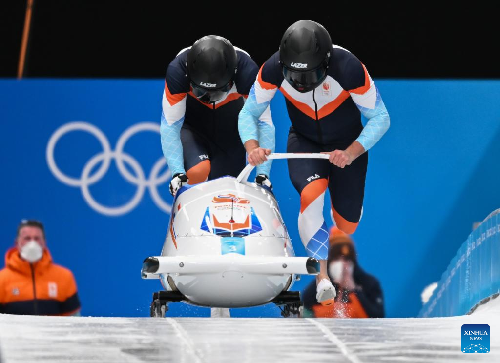 Ivo de Bruin/Jelen Franjic of the Netherlands compete during the bobsleigh 2-man heat of Beijing 2022 Winter Olympics at National Sliding Centre in Yanqing District, Beijing, capital of China, Feb. 14, 2022. (Xinhua/Sun Fei)
