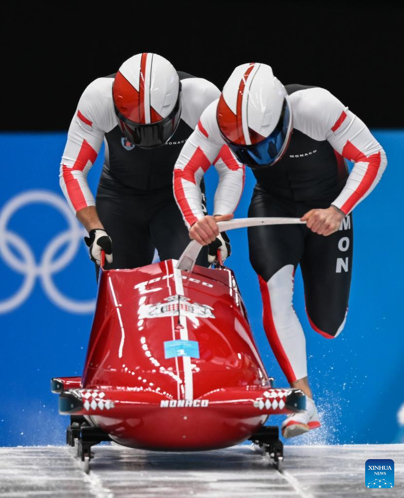 Rudy Rinaldi/Boris Vain of Monaco compete during the bobsleigh 2-man heat of Beijing 2022 Winter Olympics at National Sliding Centre in Yanqing District, Beijing, capital of China, Feb. 14, 2022. (Xinhua/Sun Fei)