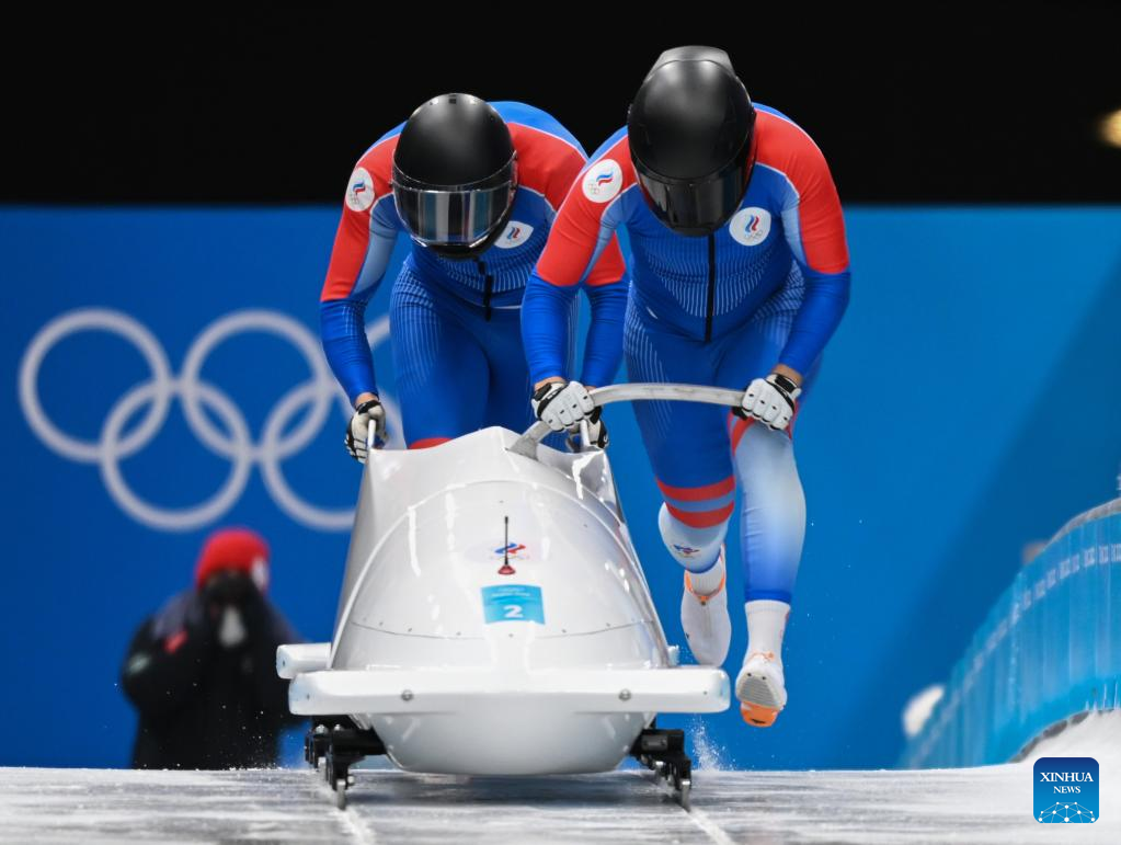 Maxim Andrianov/Vladislav Zharovtsev of ROC compete during the bobsleigh 2-man heat of Beijing 2022 Winter Olympics at National Sliding Centre in Yanqing District, Beijing, capital of China, Feb. 14, 2022. (Xinhua/Sun Fei)