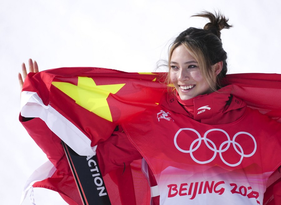 Gu Ailing of China attends the flower ceremony after the freestyle skiing women's freeski slopestyle final of Beijing 2022 Winter Olympics at Genting Snow Park in Zhangjiakou, north China's Hebei Province, Feb. 15, 2022. (Xinhua/Xue Yubin)