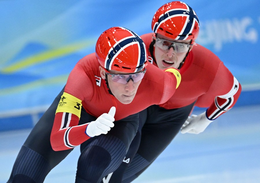 Athletes of Norway compete during the speed skating men's team pursuit finals at the National Speed Skating Oval in Beijing, capital of China, Feb. 15, 2022. (Xinhua/Wang Jianwei)
