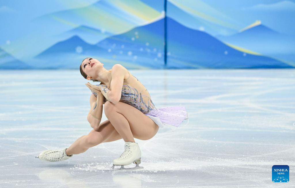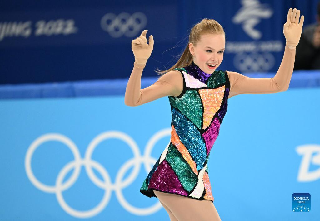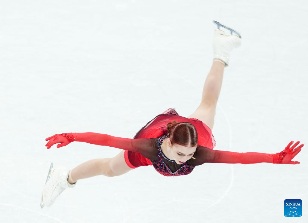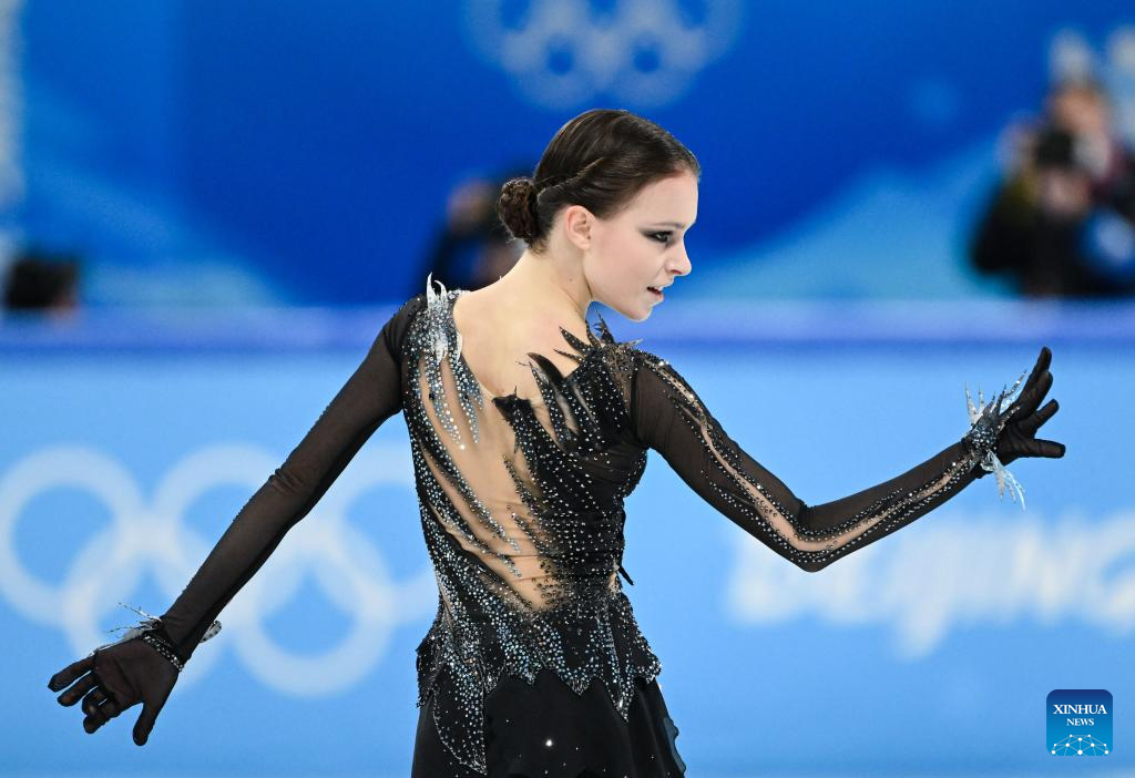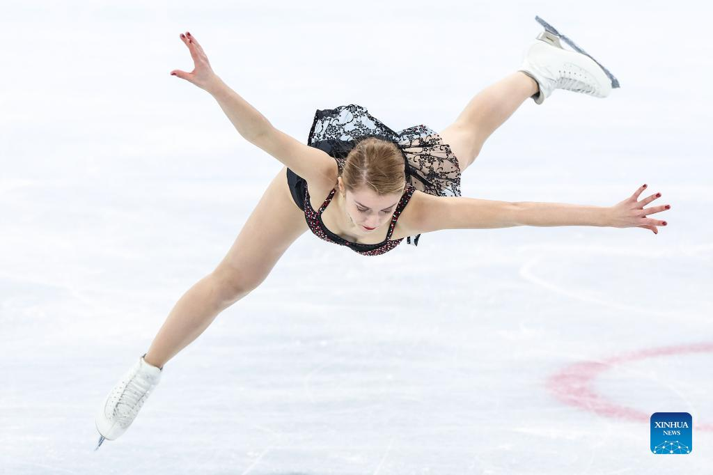 Anna Shcherbakova of ROC performs during the figure skating women single skating short program at Capital Indoor Stadium in Beijing, capital of China, Feb. 15, 2022. (Xinhua/Ma Ning)
