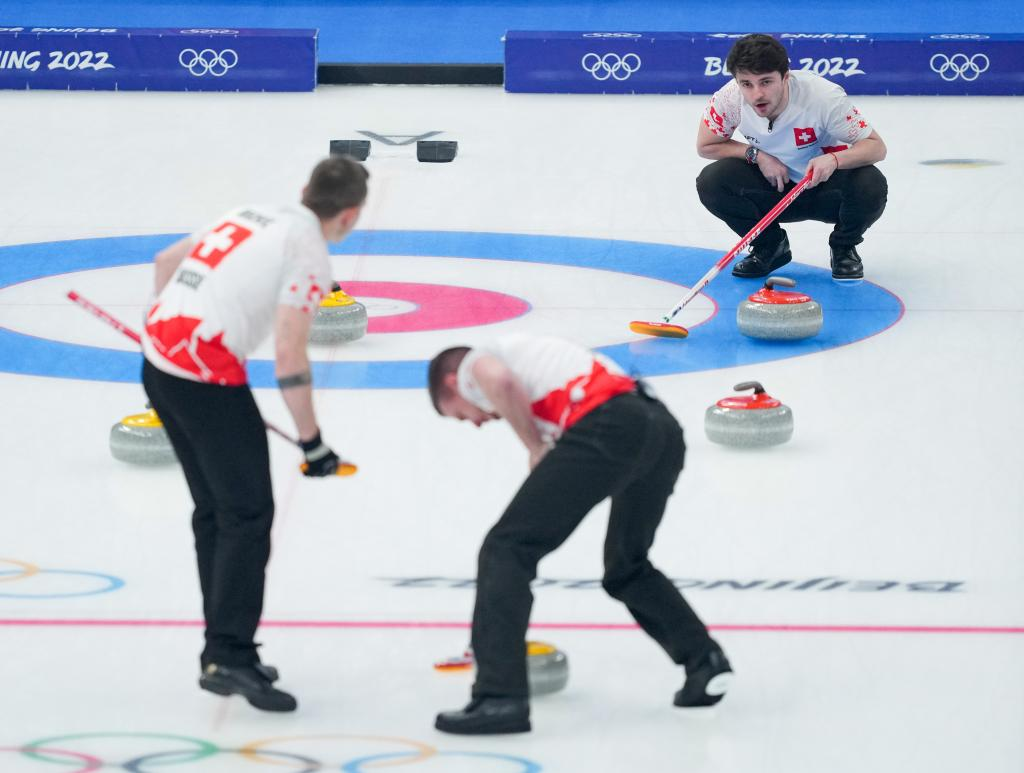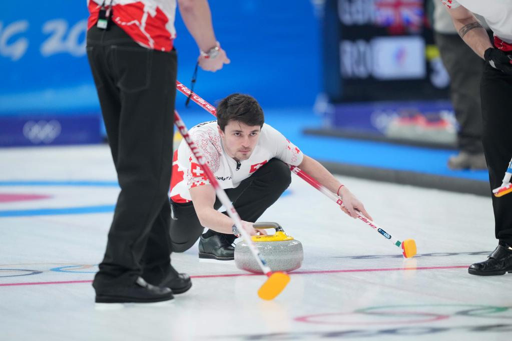 Benoit Schwarz (top) of Switzerland competes during the curling men's round robin session 11 of Beijing 2022 Winter Olympics between China and Switzerland at National Aquatics Centre in Beijing, capital of China, Feb. 16, 2022. (Xinhua/Zhou Mi)