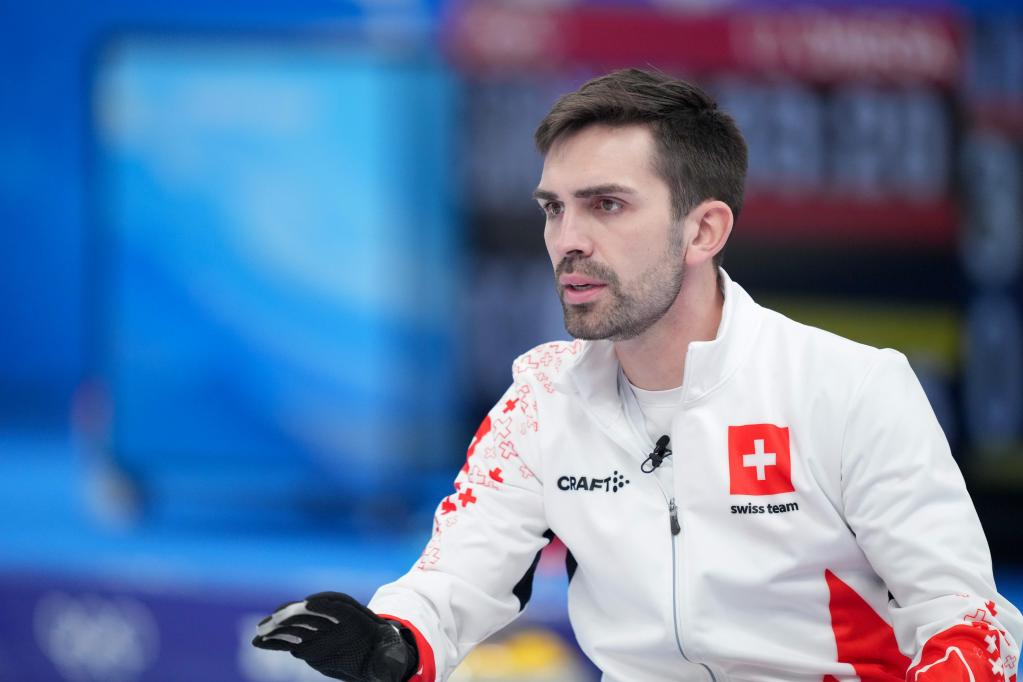 Peter de Cruz de Switzerland competes during the curling men's round robin session 11 of Beijing 2022 Winter Olympics between China and Switzerland at National Aquatics Centre in Beijing, capital of China, Feb. 16, 2022. (Xinhua/Zhou Mi)
