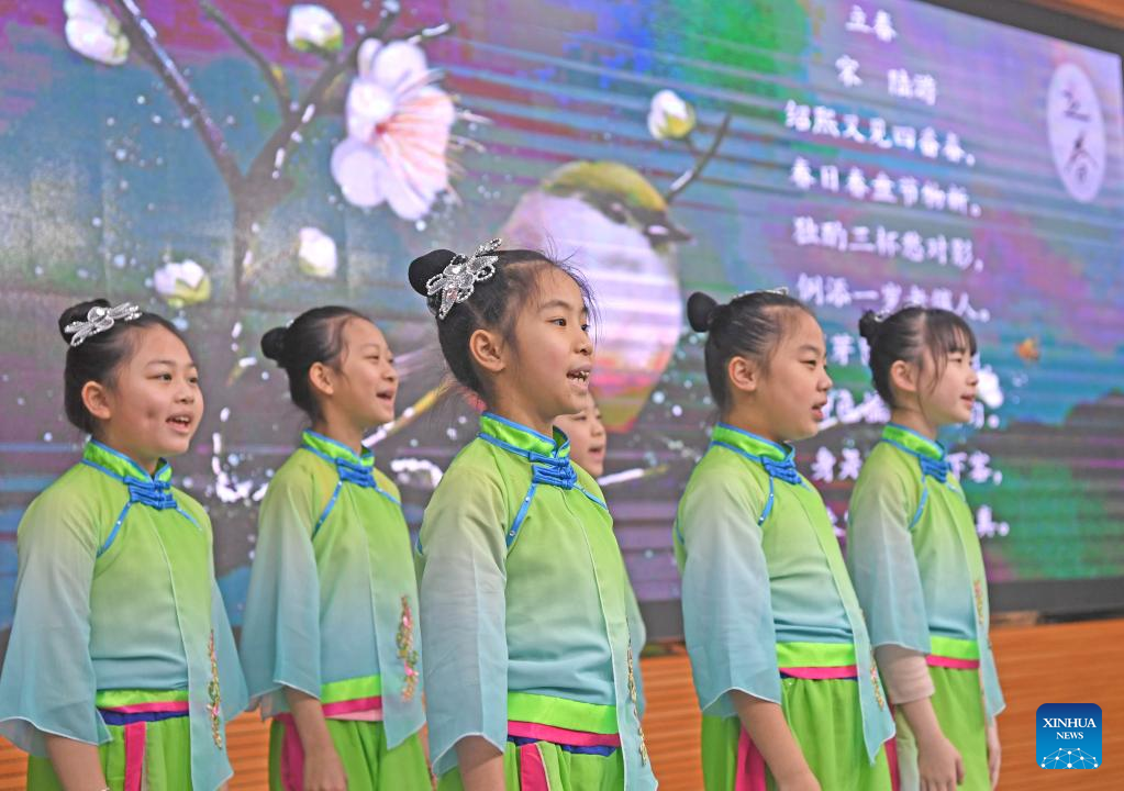 Students stage a performance in Binhulu Primary School in Nanning, south China's Guangxi Zhuang Autonomous Region, Feb. 21, 2022.