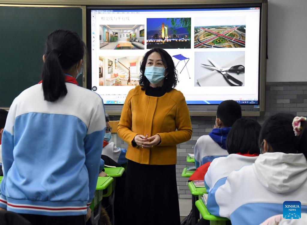 Head of Binhulu Primary School Xie Xiaoyan gives a lesson in the school in Nanning, south China's Guangxi Zhuang Autonomous Region, Feb. 21, 2022.