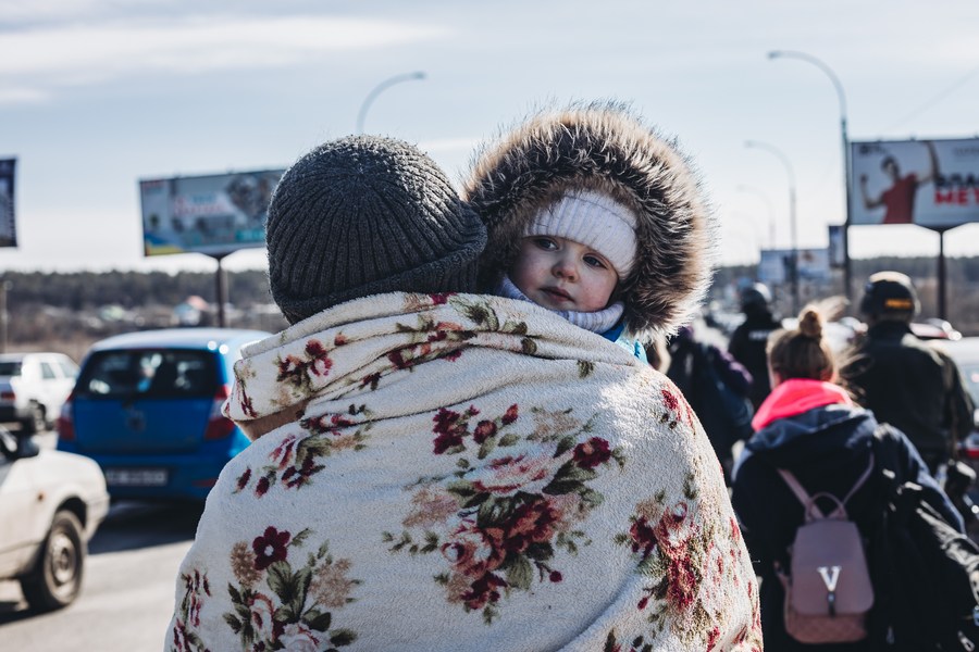 People evacuate in Irpin, Ukraine, March 11, 2022. (Photo by Diego Herrera/Xinhua)