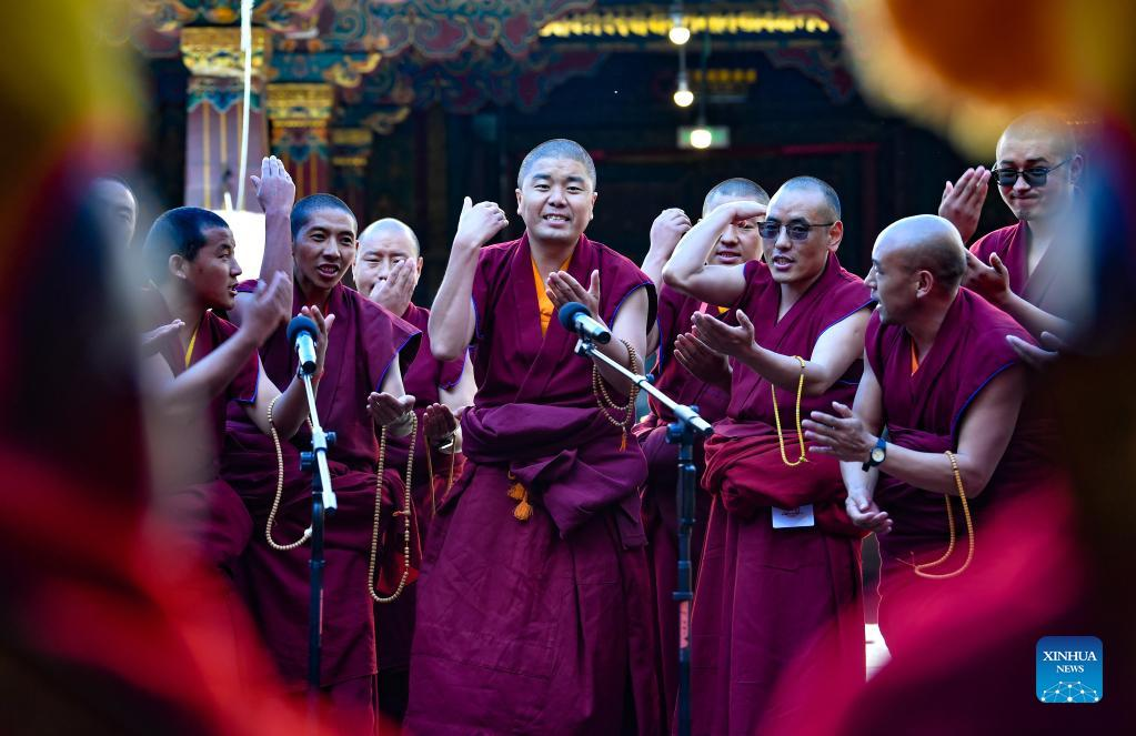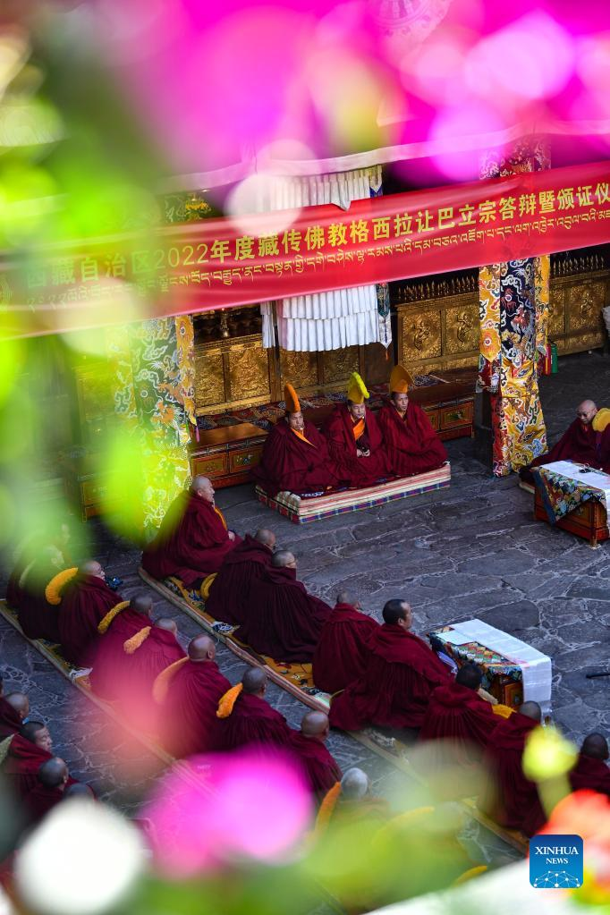 Monks attend the debate activity, a part of the award ceremony of the degree of Geshe Lharampa held in the Jokhang Temple in Lhasa, capital of southwest China's Tibet Autonomous Region, April 2, 2022. Thirteen monks were awarded the degree of Geshe Lharampa on Saturday in the Jokhang Temple in downtown Lhasa. Geshe Lharampa, which means "intellectual" in the Tibetan language, is the highest academic degree for the Gelugba School -- also known as the Yellow Sect -- of Tibetan Buddhism. The history of Geshe Lharampa goes back 400 years. (Xinhua/Jigme Dorje)
