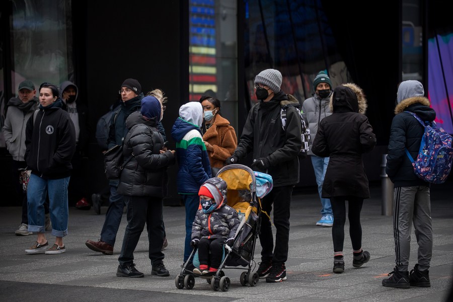 People walk on Times Square in New York, the United States, March 28, 2022. (Photo by Michael Nagle/Xinhua)