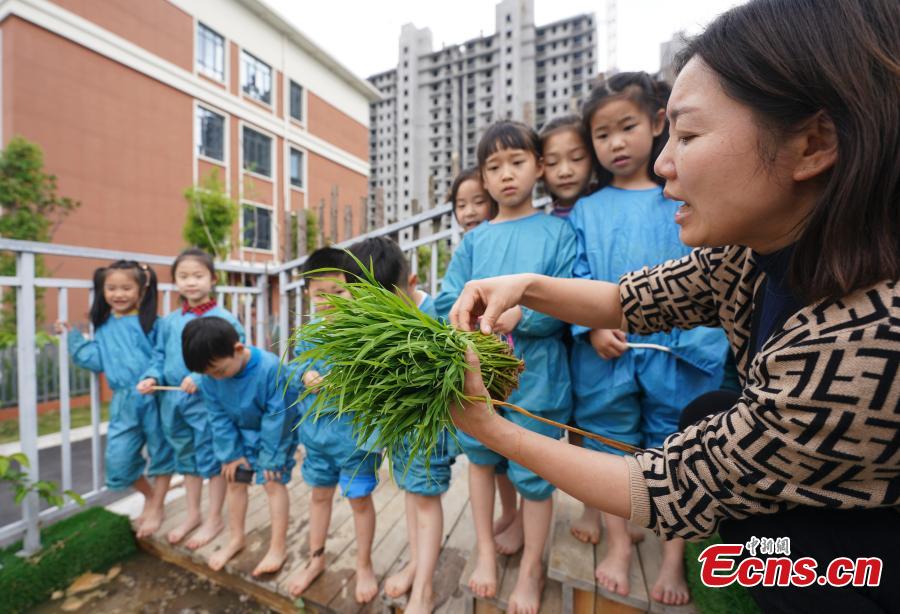 Children learn to transplant rice seedlings at a kindergarten at Xinyu, east China's Jiangxi Province, April 14, 2022. (Photo: China News Service/Zhao Chunliang)