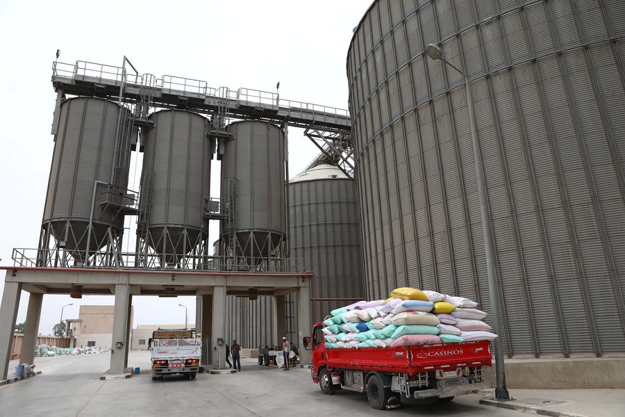 Vehicles loaded with wheat are seen at a grain silo in Banha of Qalyubia Governorate, Egypt, on May 16, 2022. (Xinhua/Ahmed Gomaa)