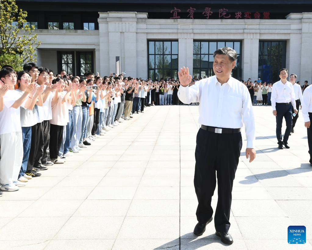 Chinese President Xi Jinping, also general secretary of the Communist Party of China Central Committee and chairman of the Central Military Commission, waves to teachers and students while visiting Yibin University in Yibin, southwest China's Sichuan Province, June 8, 2022. Xi made an inspection tour of southwest China's Sichuan Province on Wednesday. (Xinhua/Xie Huanchi)