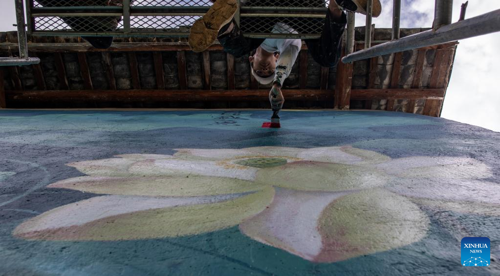Liu Zhicheng works on a wall painting in Yongsheng County, Lijiang City, southwest China's Yunnan Province, June 24, 2022.