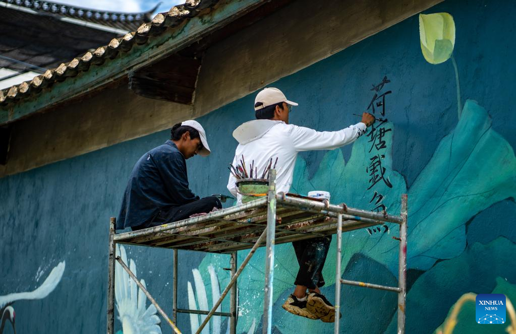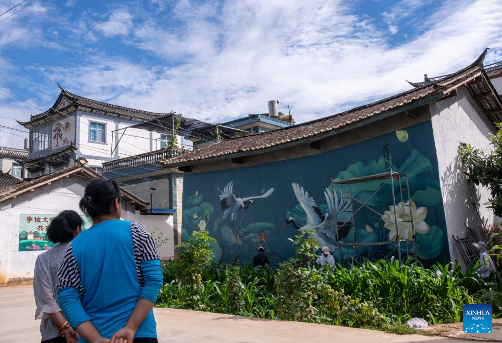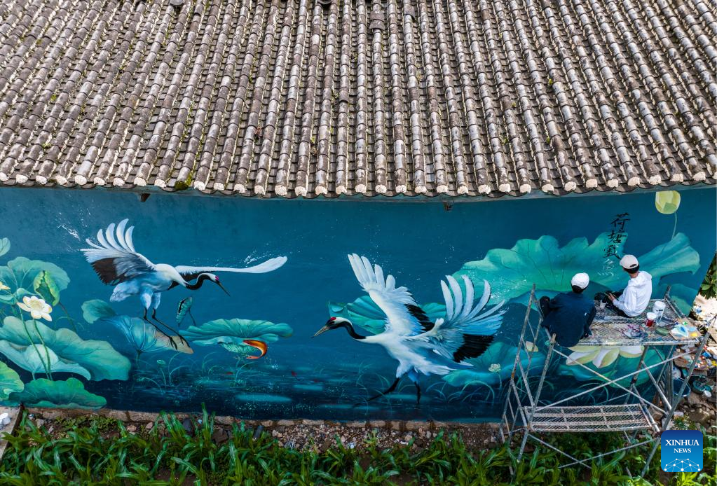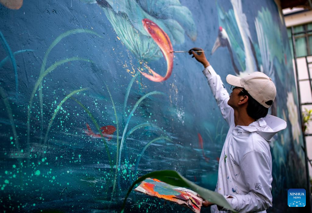Pic story: mural artist paints wall paintings in hometown in SW China