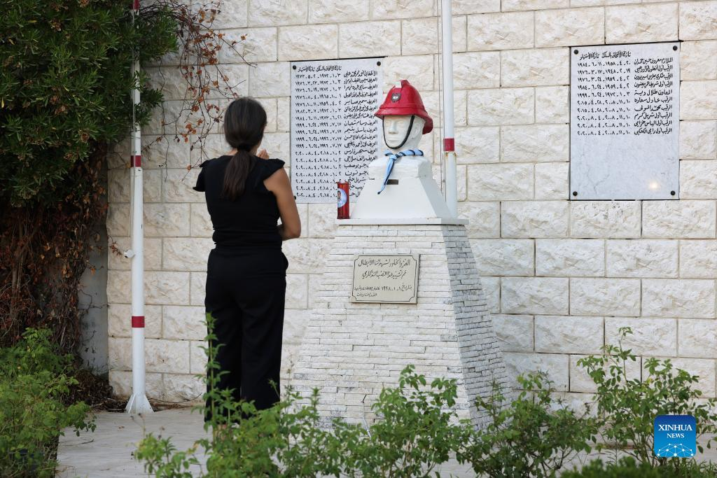 A woman pays tribute to a monument during a memorial event held at the Beirut Fire Brigade's headquarters in Beirut, Lebanon, on Aug. 3, 2022. The Beirut Fire Brigade held a memorial event on Wednesday to pay tribute to the firefighters who lost their lives in Beirut port explosion on Aug. 4, 2020. (Xinhua/Liu Zongya)