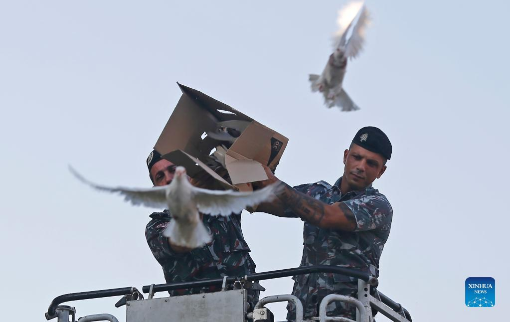 Doves are released at a memorial event held at the Beirut Fire Brigade's headquarters in Beirut, Lebanon, on Aug. 3, 2022. The Beirut Fire Brigade held a memorial event on Wednesday to pay tribute to the firefighters who lost their lives in Beirut port explosion on Aug. 4, 2020. (Xinhua/Bilal Jawich)