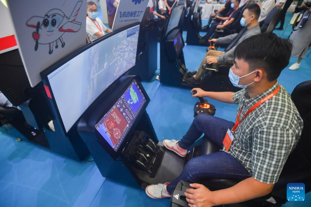 Visitors experience flight simulators during the 2022 Hunan (International) General Aviation Industry Expo at the Changsha International Convention and Exhibition Center in Changsha, central China's Hunan Province, Sept. 1, 2022. The 2022 Hunan (International) General Aviation Industry Expo opened here on Thursday. The expo comprises a static exhibition at the Changsha International Convention and Exhibition Center in Changsha and an air show at the Lusong Airport of Zhuzhou City, both in central China's Hunan Province. (Xinhua/Chen Zeguo)