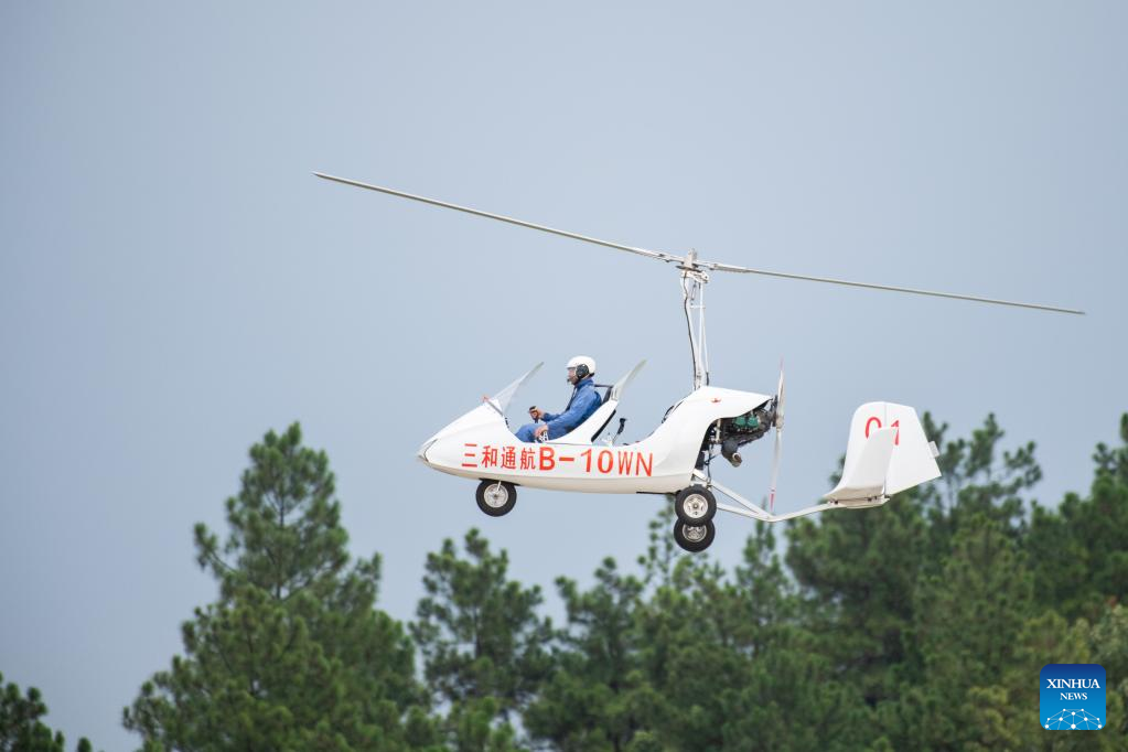 A gyroplane performs during an air show, which is a part of the 2022 Hunan (International) General Aviation Industry Expo, at the Lusong Airport of Zhuzhou City, central China's Hunan Province, Sept. 1, 2022. The 2022 Hunan (International) General Aviation Industry Expo opened here on Thursday. The expo comprises a static exhibition at the Changsha International Convention and Exhibition Center in Changsha and an air show at the Lusong Airport of Zhuzhou City, both in central China's Hunan Province. (Xinhua/Chen Sihan)