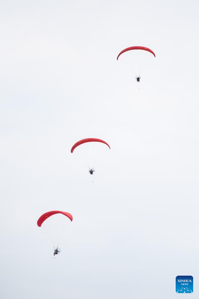 A fleet of gyroplanes fly during an air show, which is a part of the 2022 Hunan (International) General Aviation Industry Expo, at the Lusong Airport of Zhuzhou City, central China's Hunan Province, Sept. 1, 2022. The 2022 Hunan (International) General Aviation Industry Expo opened here on Thursday. The expo comprises a static exhibition at the Changsha International Convention and Exhibition Center in Changsha and an air show at the Lusong Airport of Zhuzhou City, both in central China's Hunan Province. (Xinhua/Chen Sihan)