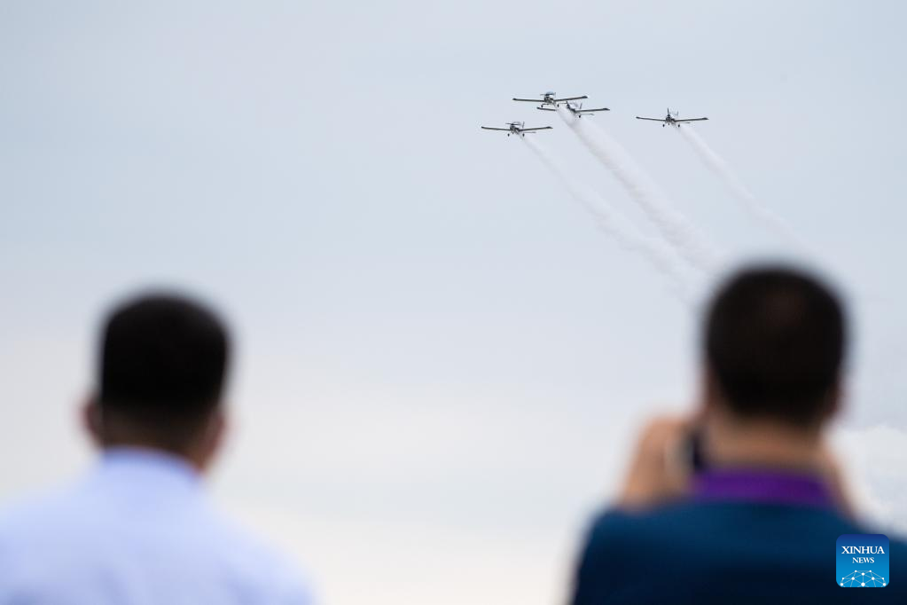 Performance is staged during an air show, which is a part of the 2022 Hunan (International) General Aviation Industry Expo, at the Lusong Airport of Zhuzhou City, central China's Hunan Province, Sept. 1, 2022. The 2022 Hunan (International) General Aviation Industry Expo opened here on Thursday. The expo comprises a static exhibition at the Changsha International Convention and Exhibition Center in Changsha and an air show at the Lusong Airport of Zhuzhou City, both in central China's Hunan Province. (Xinhua/Chen Sihan)