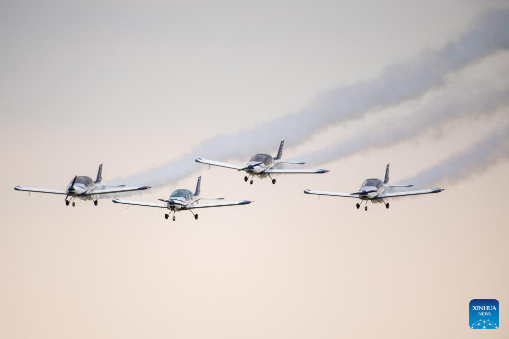A fleet of fixed-wing aircraft fly during an air show, which is a part of the 2022 Hunan (International) General Aviation Industry Expo, at the Lusong Airport of Zhuzhou City, central China's Hunan Province, Sept. 1, 2022. The 2022 Hunan (International) General Aviation Industry Expo opened here on Thursday. The expo comprises a static exhibition at the Changsha International Convention and Exhibition Center in Changsha and an air show at the Lusong Airport of Zhuzhou City, both in central China's Hunan Province. (Xinhua/Chen Sihan)