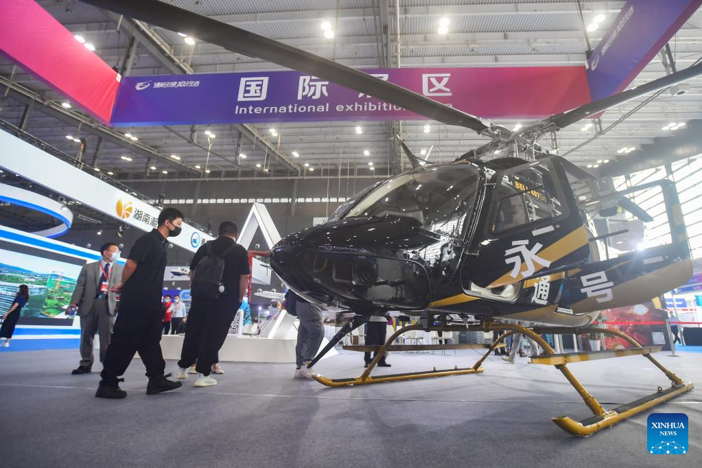 A helicopter is displayed during the 2022 Hunan (International) General Aviation Industry Expo at the Changsha International Convention and Exhibition Center in Changsha, central China's Hunan Province, Sept. 1, 2022. The 2022 Hunan (International) General Aviation Industry Expo opened here on Thursday. The expo comprises a static exhibition at the Changsha International Convention and Exhibition Center in Changsha and an air show at the Lusong Airport of Zhuzhou City, both in central China's Hunan Province. (Xinhua/Chen Zeguo)