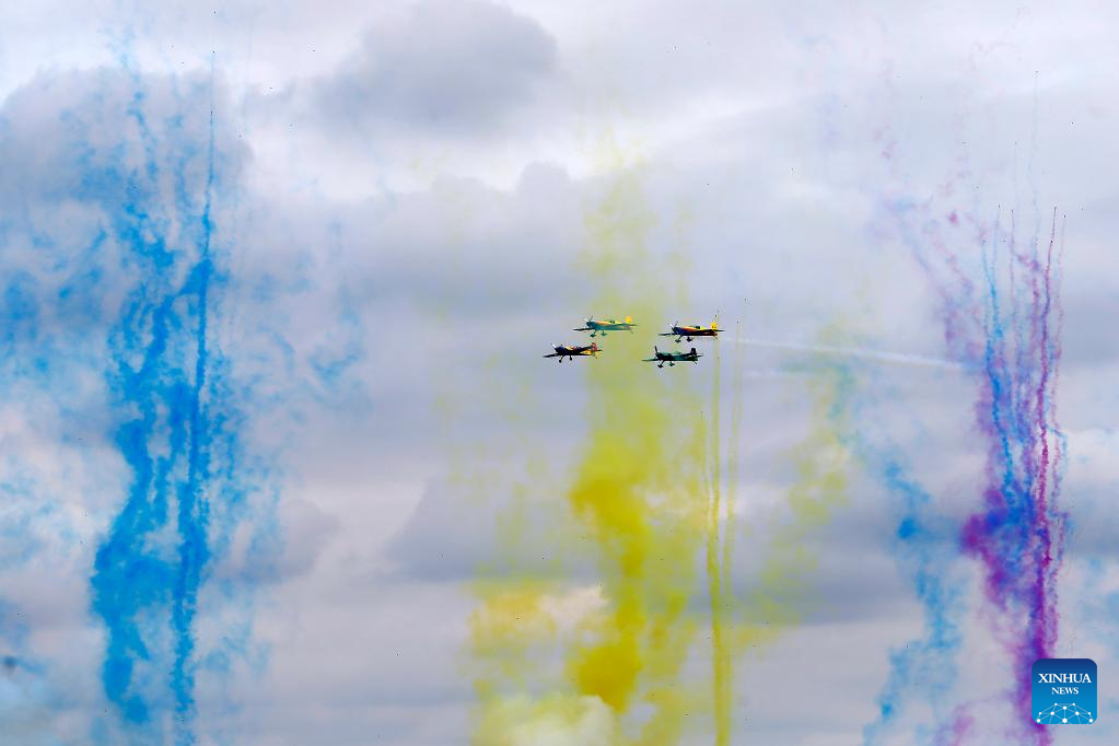 An aerobatic team performs during Bucharest International Air Show &General Aviation Exhibition in Bucharest, Romania, on Sept. 4, 2022. (Photo by Cristian Cristel/Xinhua)
