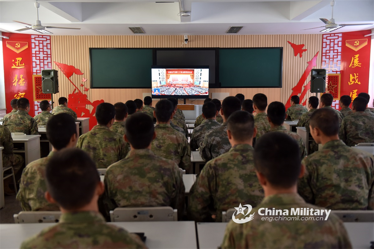 Soldiers assigned to a combined-arms brigade under the PLA 82nd Group Army watch the opening ceremony of the 20th National Congress of the Communist Party of China on October 16, 2022. (eng.chinamil.com.cn/Photo by Sun Tongkai)