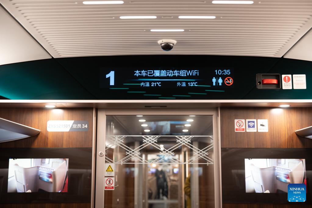 This photo taken on Jan. 16, 2023 shows an interior view of the Fuxing Electric Multiple Unit (EMU) CR400BF-GZ in northeast China's Heilongjiang Province. The most frost-resistant and most intelligent member of China's Fuxing bullet train family, the Fuxing EMU CR400BF-GZ, settled on Monday in northeast China's Heilongjiang Province. This is the region of the highest latitude and the lowest temperature that the EMU, with an operating speed of 350 km per hour, has ever reached by far. (Xinhua/Zhang Tao)