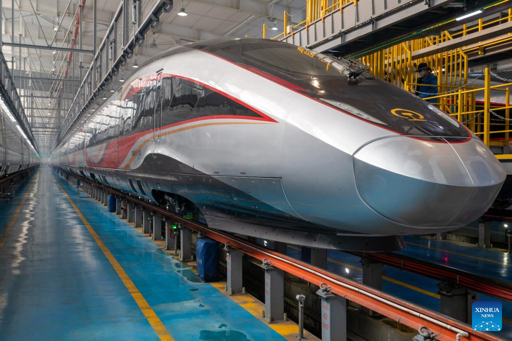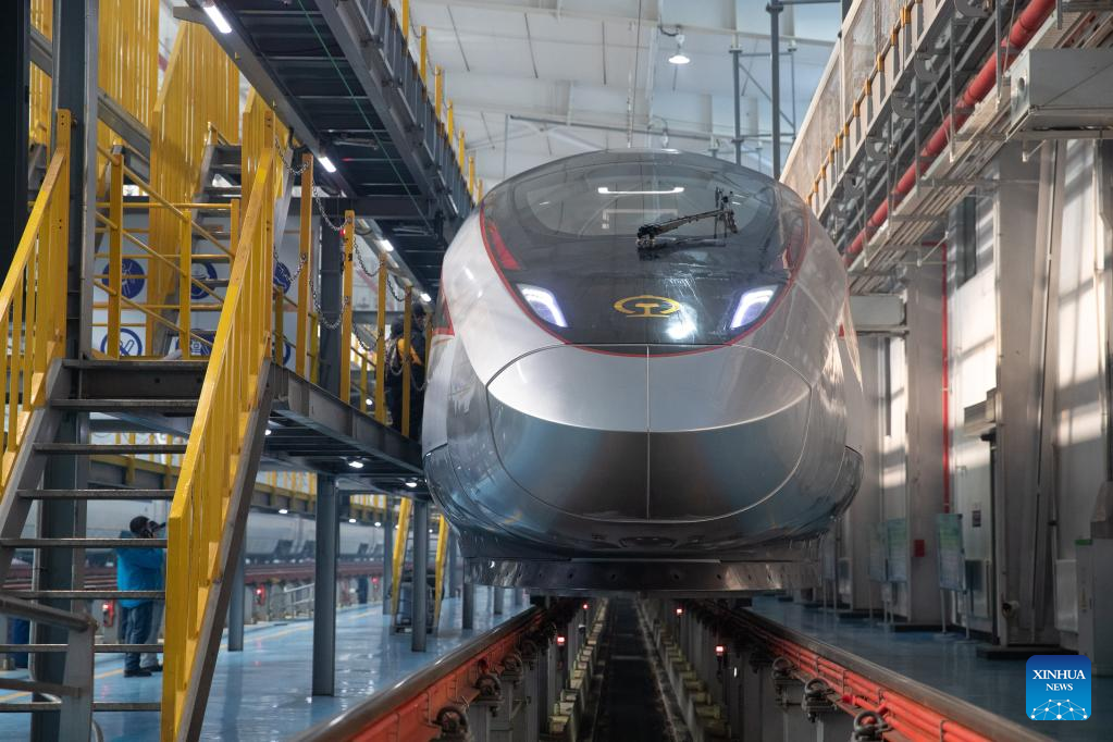 This photo taken on Jan. 16, 2023 shows the Fuxing Electric Multiple Unit (EMU) CR400BF-GZ at a maintenance station of China Railway Harbin Bureau Group Co., Ltd. in northeast China's Heilongjiang Province. The most frost-resistant and most intelligent member of China's Fuxing bullet train family, the Fuxing EMU CR400BF-GZ, settled on Monday in northeast China's Heilongjiang Province. This is the region of the highest latitude and the lowest temperature that the EMU, with an operating speed of 350 km per hour, has ever reached by far. (Xinhua/Zhang Tao)