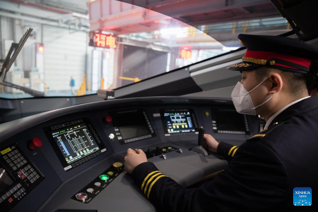A staff member tests and adjusts equipment in the cockpit of the Fuxing Electric Multiple Unit (EMU) CR400BF-GZ, northeast China's Heilongjiang Province, Jan. 16, 2023. The most frost-resistant and most intelligent member of China's Fuxing bullet train family, the Fuxing EMU CR400BF-GZ, settled on Monday in northeast China's Heilongjiang Province. This is the region of the highest latitude and the lowest temperature that the EMU, with an operating speed of 350 km per hour, has ever reached by far. (Xinhua/Zhang Tao)