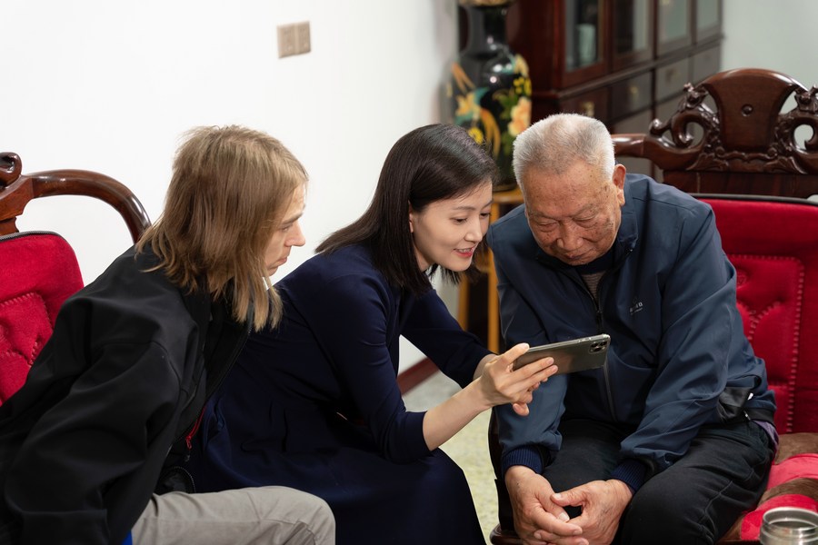 British scientist Alice C. Hughes (L) and Xinhua correspondent Miao Xiaojuan (C) visit Hu Jinchu, renowned giant panda expert in Nanchong City, southwest China's Sichuan Province, April 22, 2021. (Xinhua/Xu Yongzheng)