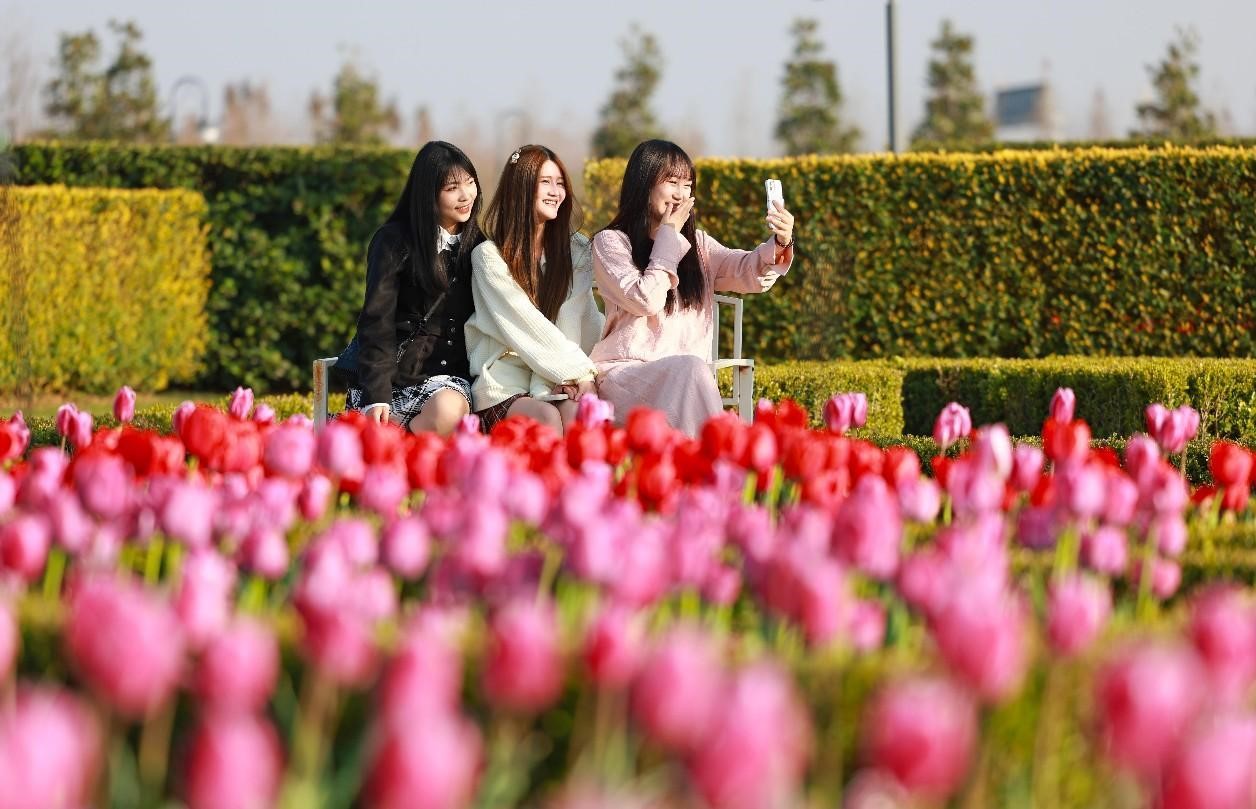 Visitors pose for pictures in a flower-themed scenic spot in Fengcheng, east China's Jiangxi province, March 6, 2023. (People's Daily Online/Wang Kun)