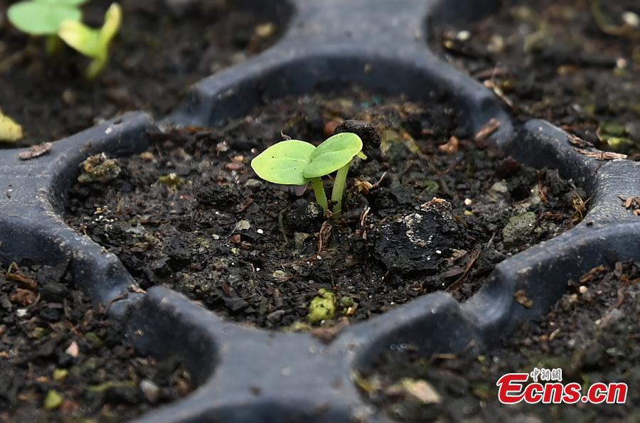 Photo shows the sprouting cotton rose seeds that returned from space with China's Shenzhou-14 and 15 manned spaceships at Chengdu Botanical Garden, southwest China's Sichuan Province, March 22, 2023. (Photo: China News Service/An Yuan)