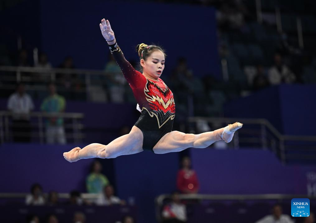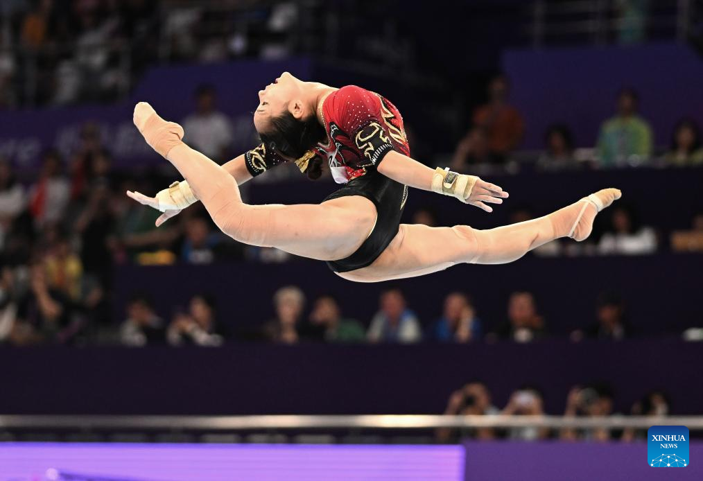 Tang Xijing of China competes on the floor of Women's Qualification and Team Final of artistic gymnastics at the 19th Asian Games in Hangzhou, east China's Zhejiang Province, Sept. 25, 2023. (Xinhua/Cheng Min)