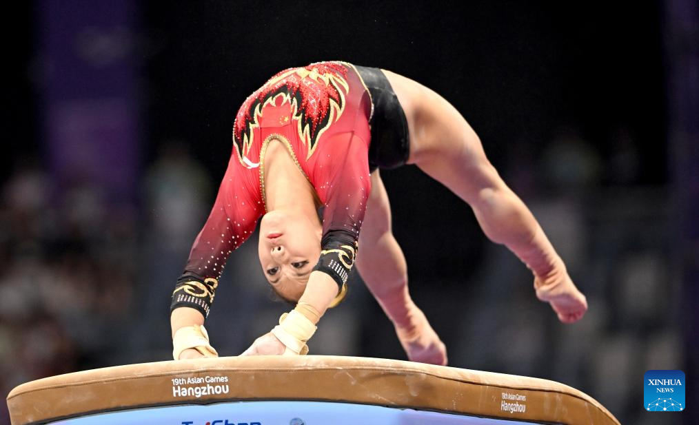 Zuo Tong of China competes on the vault of Women's Qualification and Team Final of artistic gymnastics at the 19th Asian Games in Hangzhou, east China's Zhejiang Province, Sept. 25, 2023. (Xinhua/Cheng Min)