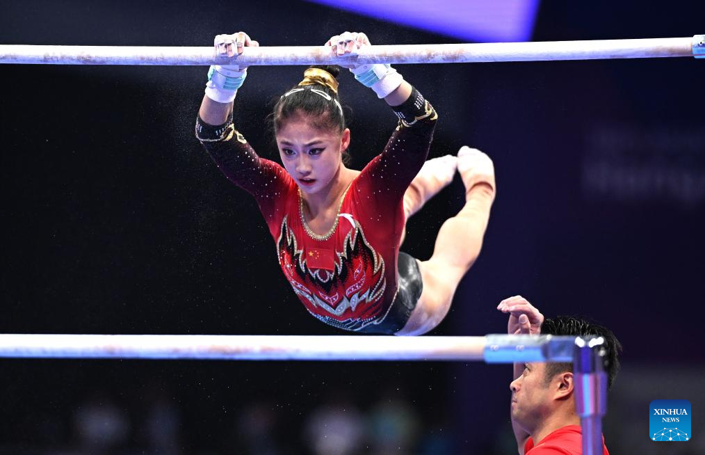 Zuo Tong of China competes on the uneven bars of Women's Qualification and Team Final of artistic gymnastics at the 19th Asian Games in Hangzhou, east China's Zhejiang Province, Sept. 25, 2023. (Xinhua/Cheng Min)